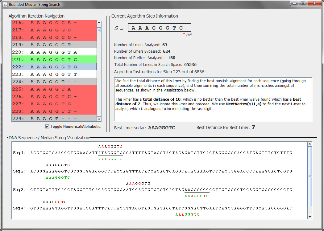 For a semester-long project in a graduate-level Bioinformatics course, I focused on a problem that many of my classmates were facing – as the course was interdisciplinary, not all enrolled students were computer scientists: out of the approximately twenty students in the course, several were mathematics, biology, and even physics majors, and thus many students had trouble understanding the more complex algorithms covered in the course. Compounding this issue, many of these difficult algorithms relied on thinking multidimensionally – for example, as required in multiple sequence alignment – which, while intuitive to most graduate students in computing science, is inherently difficult to convey in a textbook or slides without strong visual support.