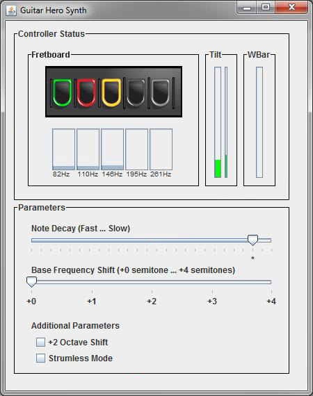In 2008-2009, music and rhythm video games such as Rock Band and Guitar Hero were extremely popular with both children and adults; most notably, these games motivated people to attempt to learn new instruments – the most apparent being the transition from drumming in Rock Band to learning to play on a real drum set. However, the mapping from the plastic guitar controller to a real guitar was nowhere near as natural as that from the plastic drums to a real drum set; in this vein, I aimed to bridge this gap by taking advantage of the guitar controller’s inherent simplicity and familiarity to allow users to create simple, yet expressive music.